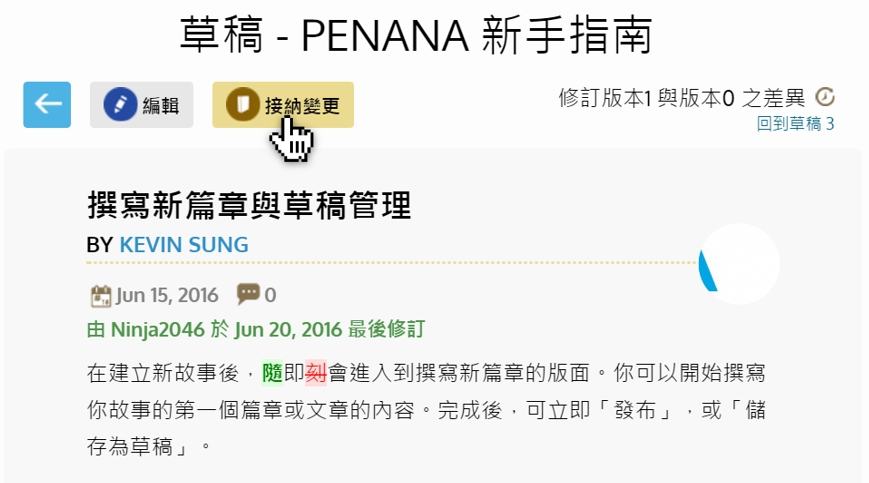 修訂被接納後,提出修訂建議者將會收到通知。而你亦可在「草稿」頁面中追蹤篇章的修訂歷史。