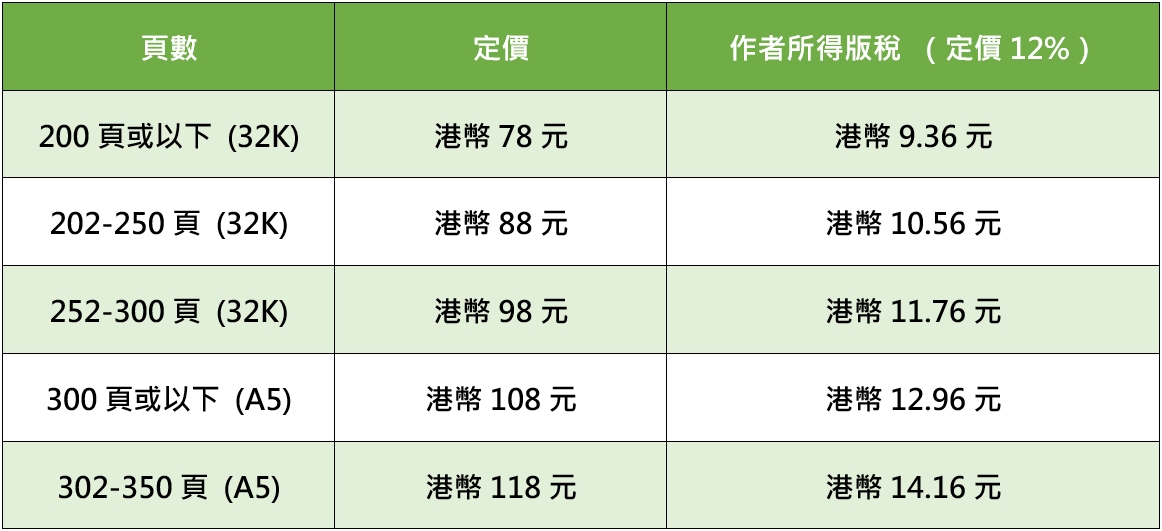 申請將書籍發行至香港書店-港幣 10,000 元起(需進一步確認,稍後付款) 已包括文字校對服務。書本定價為$78-98元,作者版稅為定價50%。有關發行詳情,請參考山道網頁:https://hillway.com.hk/publish,或聯絡山道出版社:https://hillway.com.hk/contact